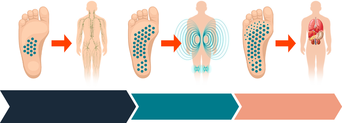 FÁZE 1: Systém magnetů ve středu chodidla vytváří skalární pole, které pomáhá uvolňovat lymfatické cesty a podporuje správnou činnost nervových buněk. Dochází k aktivaci hluboké regenerace a díky automatické biostimulaci tělo cílí přímo na zdroj bolesti.